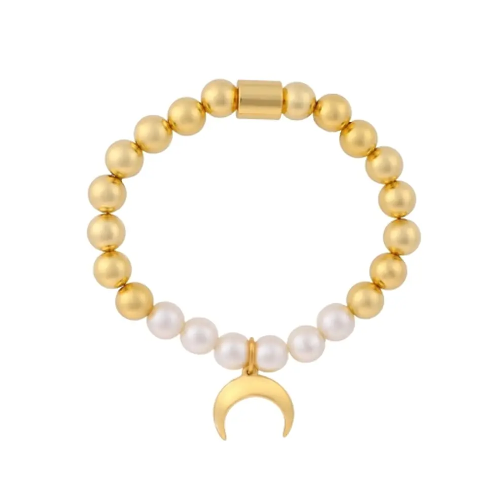 Bransoletka z kuleczek pokrytych 24 karatowym złotem i syntetycznych perełek o długości 18cm. Zawieszka księżyc o szerokości 1,7 cm.