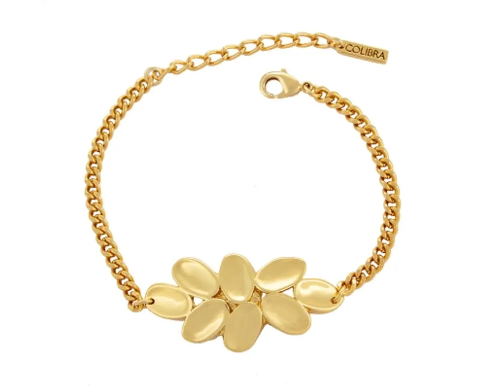 Bransoletka pozłacana, wykonana z owalnych elementów tworzących jedną całość. Długość bransoletki 17,0 cm + 4,0 cm przedłużki, szerokość 0,4 cm. Wielkość ozdoby 4,0 cm x 2,0 cm. Waga bransoletki 13,0 g.