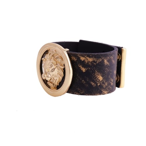 Czarna z poświatą złota bransoletka skórzana z głową lwa