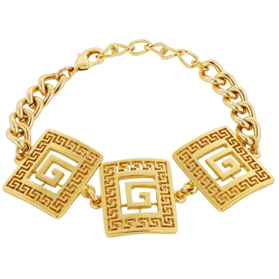 Bransoletka pozłacana z trzema prostokątami zdobionymi motywem greckim. Długość 18,0 cm. Wielkość prostokątów 2,2 cm x 2,8 cm. Waga bransoletki 25,0 g.