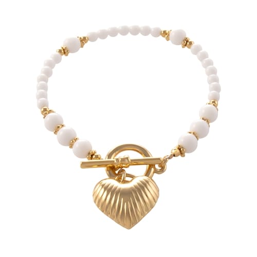Stylowa bransoletka wykonana z naturalnych kamieni agatowych, ozdobiona ryflowaną zawieszką w kształcie serca. Gładkie, lekko połyskujące agaty pięknie komponują się z delikatną fakturą zawieszki, tworząc biżuterię, która przyciąga spojrzenia i emanuje pozytywną energią. To idealny wybór dla osób ceniących zarówno klasykę, jak i symboliczne dodatki.