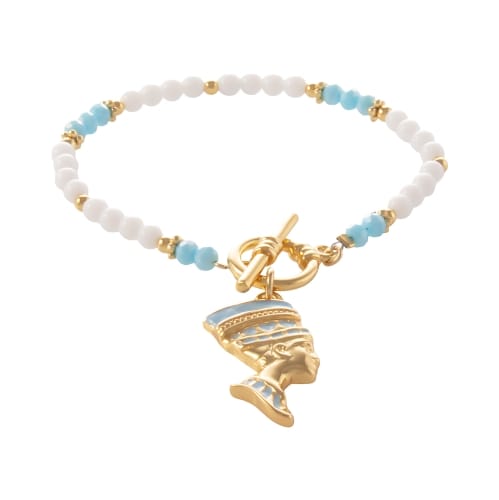 Subtelna, a zarazem wyrazista, ręcznie wykonana bransoletka z agatów to wyjątkowy dodatek dla kobiet ceniących oryginalność i symbolikę. Główną ozdobą jest zawieszka z wizerunkiem Nefretete – legendarnej królowej Egiptu, uosabiającej siłę, piękno i ponadczasową elegancję. Idealna do noszenia solo lub w zestawie z naszyjnikiem z tej samej kolekcji. Długość bransoletki 18 cm.