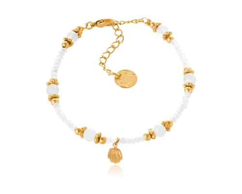 Bransoletka z białych koralików z muszelką z kolekcji Aqualessia – delikatny i uroczy akcent, który doskonale uzupełni Twoją stylizację! Długość bransoletki 16 cm + 4 cm przedłużki.