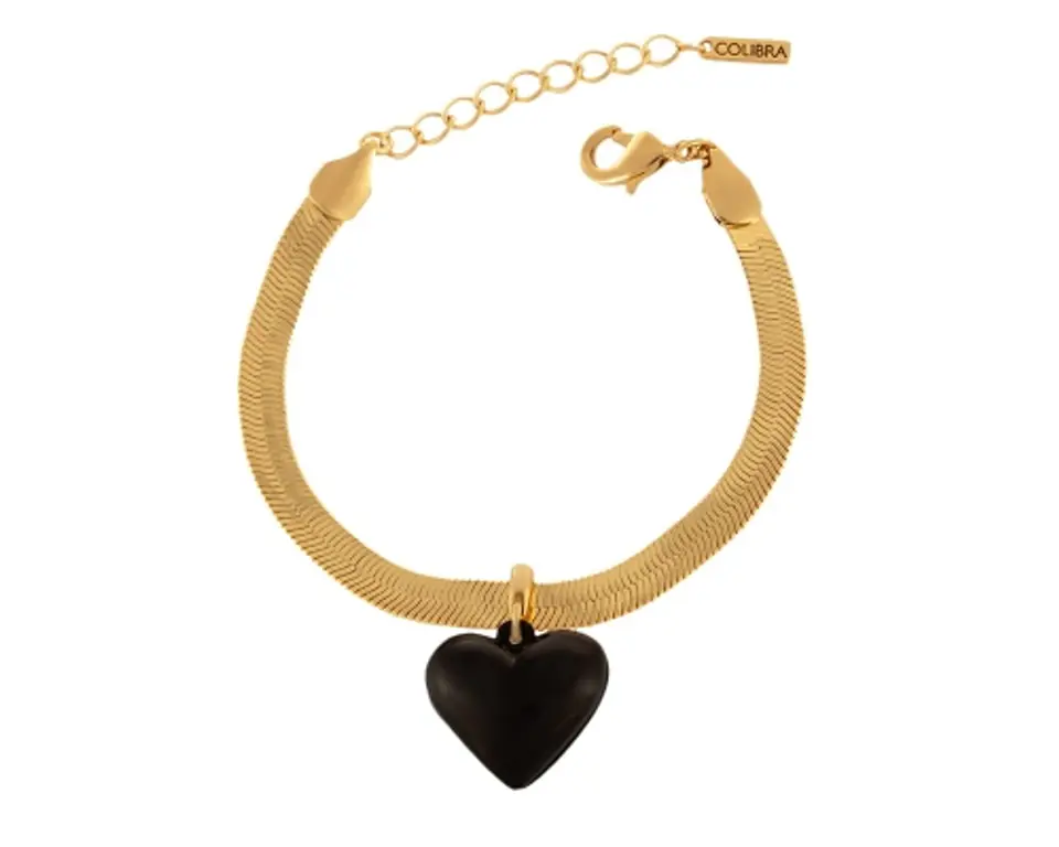 Pozłacana bransoletka z czarnym, pękatym serduszkiem. Długość bransoletki 18 cm + 4 cm przedłużki. Szerokość łańcuszka 0,6 cm. Wymiary serduszka 2 cm/ 2 cm. Waga naszyjnika 15 g.