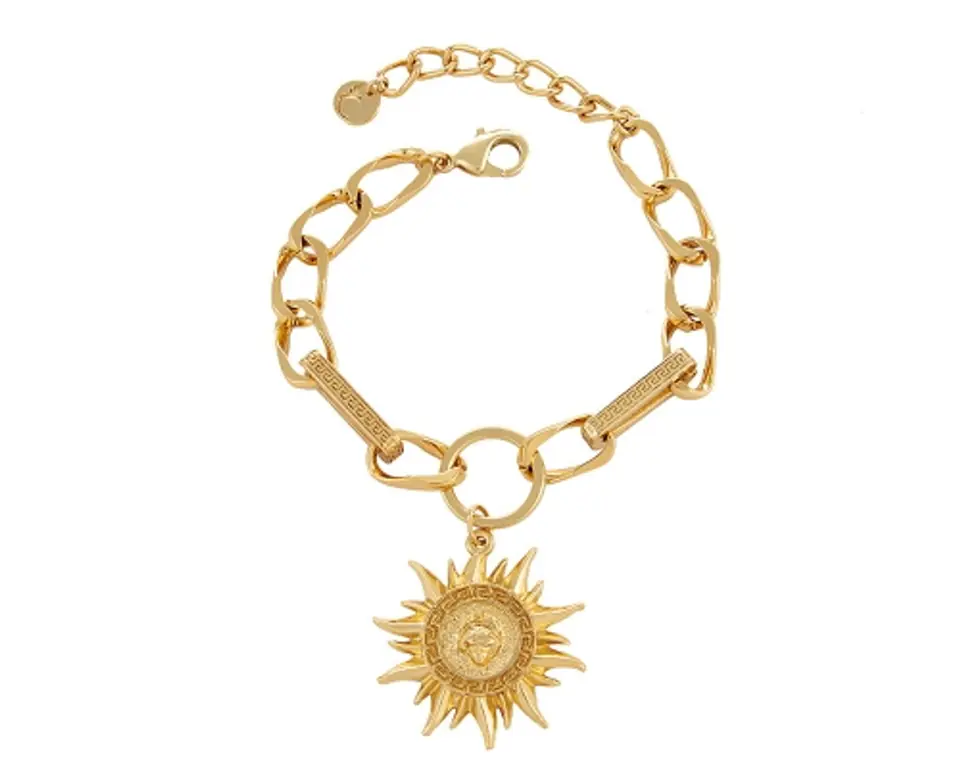 Pozłacana bransoletka z greckim słońcem Svietlana by Colibra z kolekcji Olimpia, łańcuch pancerka przetykana łącznikami z drogą grecką . Długość 18 cm plus 4 cm przedłuższki. Zawieszka ok. 4cm