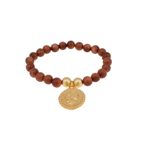 Bransoletka z mieniącego sie kamienia z pozłacanymi kulkami oraz wizerunkiem.