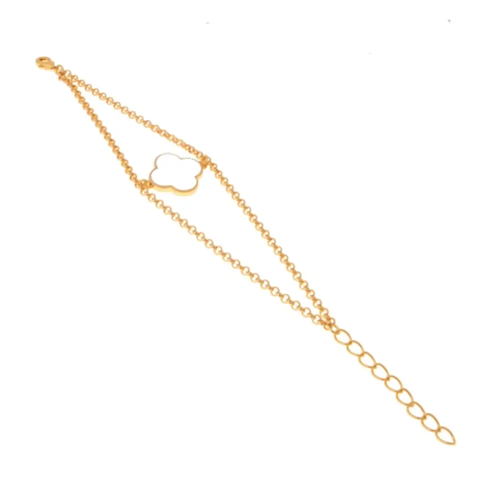 Bransoletka pozłacana z emaliowaną na biało koniczyną. Długość 16,0 cm + 4,0 cm przedłużka, szerokość 3,0 cm. Wielkość ozdoby 2,5 cm x 2,0 cm. Waga bransoletki 9,0 g.