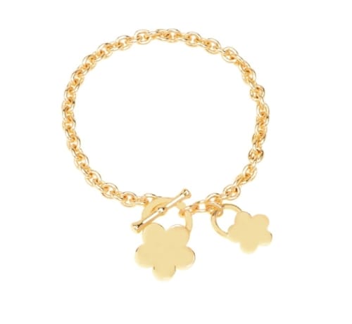 Najnowsza kolekcja bransoletka z uroczymi kwiatkami. Długość 20cm, grubość 0,2cm. Większy kwiatek 2,6cm x 1,8cm. Bransoletka pozłacana.