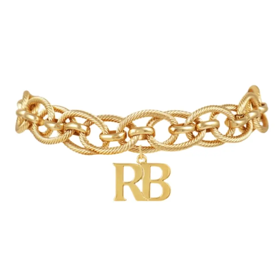 Pozłacana bransoletka o ciekawym splocie z literkami RB. Długość bransoletki 17 cm + 4 cm przedłużki. Wielkość literek 2,5 cm x 1,7 cm.