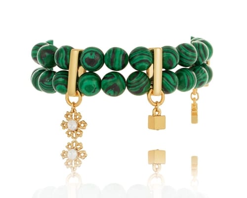 Bransoletka podwójna pozłacana z malachitów z wiszącymi elementami - sześcianem, gwiazdką i kwiatuszkiem zdobionym kryształkiem Preciosa. Bransoletka uniwersalna, na gumce. Średnica koralika 1,0 cm. Waga bransoletki 55,0 g.