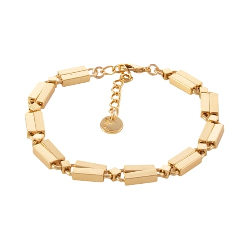 Stylowa, pozłacana bransoletka złożona z drobnych prostokątnych elementów tworzących elegancką i harmonijną kompozycję. Geometryczna forma nadaje biżuterii nowoczesnego charakteru, a subtelny połysk złotego wykończenia pięknie podkreśla nadgarstek. Dzięki minimalistycznemu designowi bransoletka doskonale sprawdzi się zarówno jako delikatny dodatek do codziennych stylizacji, jak i elegancki akcent na specjalne okazje. Może być noszona samodzielnie lub w połączeniu z innymi bransoletkami, tworząc modny zestaw. Specyfikacja:✨ Długość bransoletki: 18 cm + przedłużka 4 cm (regulacja długości)✨ Geometryczne, prostokątne elementy✨ Wykończenie: pozłacane Ponadczasowa biżuteria, która doda stylizacji subtelnego blasku i elegancji.
