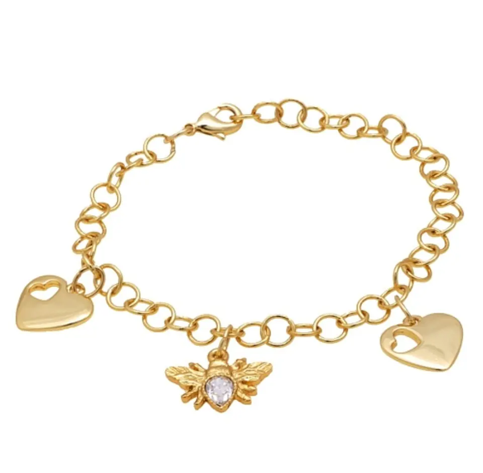 Bransoletka o długości 20cm z zawieszkami. Mucha o wymiarach 2cm x1,5cm z kryształem Preciosa oraz serduszko 2cm x 1,5cm. Bransoletka pozłacana.