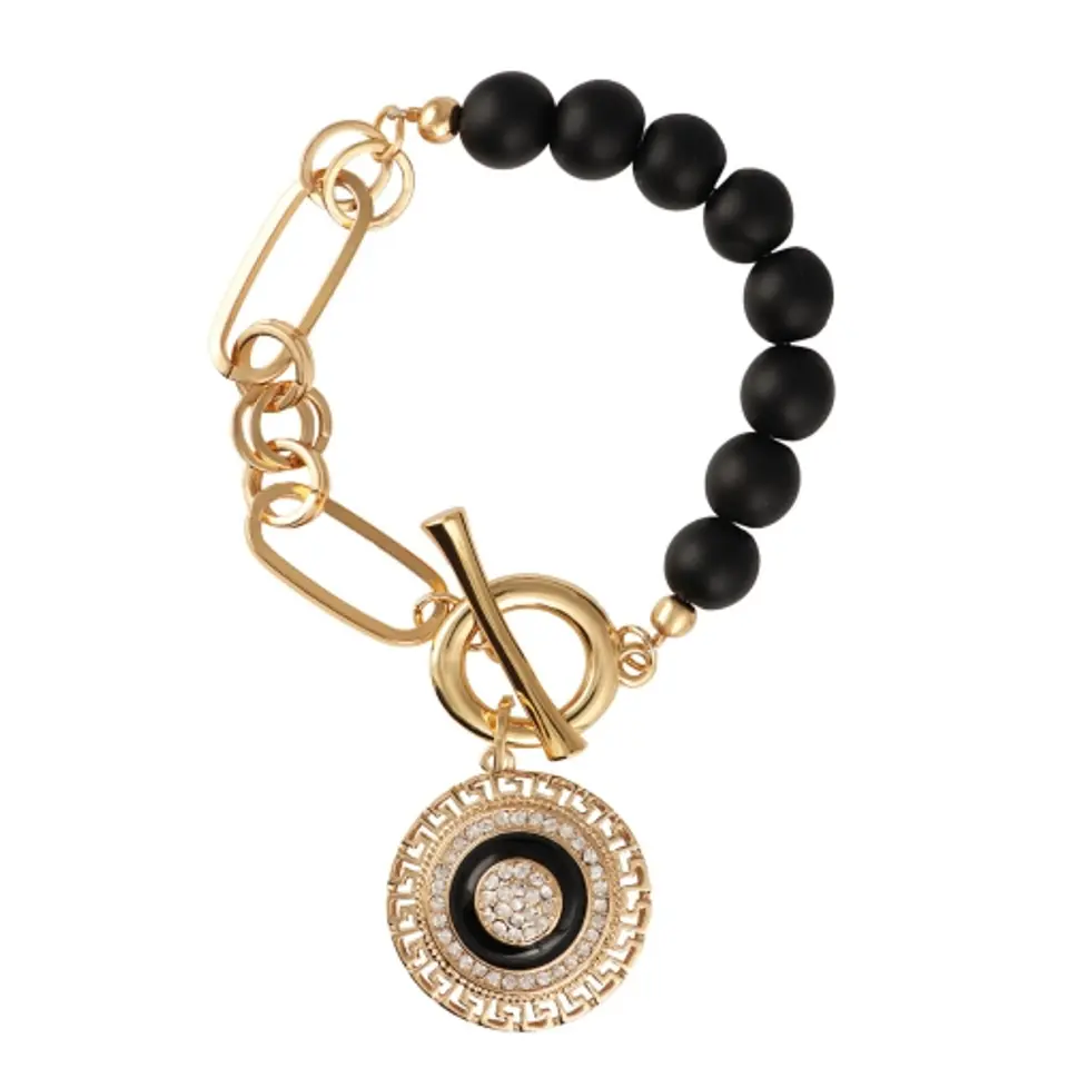 Pozłacana bransoletka z onyksami i ręcznie malowaną na czarno zawieszką, zdobioną kryształkami Preciosa. Długość bransoletki wynosi ok. 19 cm