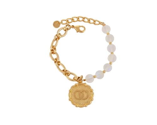 Pozłacana bransoletka z opali z zawieszką z kółkami. Długość bransoletki 18 cm + 4 cm przedłużki. Średnica zawieszki ok 2,3 cm.