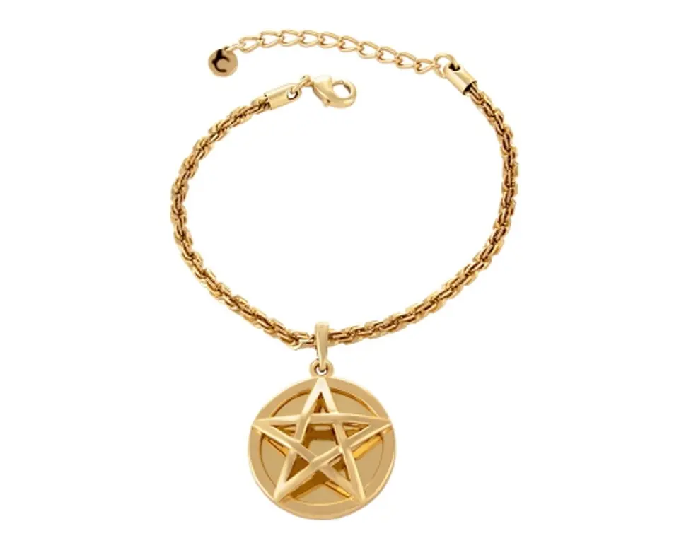 Pozłacana bransoletka talizman z pentagramem zawieszonym na łańcuszkuma właściwości ochronne.