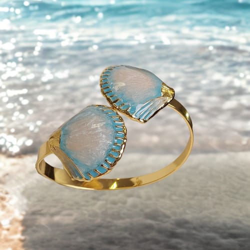 Elegancka i stylowa, sztywna bransoletka to prawdziwa ozdoba każdej letniej stylizacji. Zdobiona z muszlami w odcieniach perły i błękitu, przywołuje na myśl morską bryzę i letnie wspomnienia. Idealna dla osób, które kochają unikalne dodatki z nutą nadmorskiego klimatu.