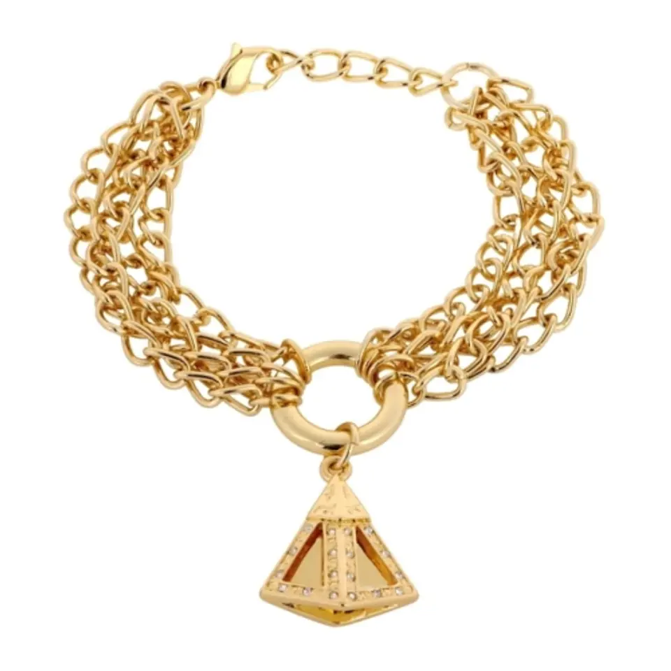 Bransoletka pozłacana z potrójnego łańcuszka z zawieszką - piramidką wysadzaną kryształkami. Długość 19,0 cm + przedłużka 3,0 cm, szerokość 2,0 cm. Wymiary piramidki 2,0 cm x 2,5 cm. Waga bransoletki 33,0 g.