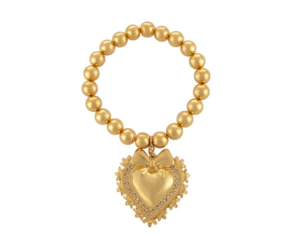 Bransoletka z pozłacanych kulek z sercem wysadzanym kryształkami Preciosa i kokardką to wyjątkowy i elegancki dodatek biżuteryjny, który wyróżnia się spośród innych ozdób swoim romantycznym urokiem i wyjątkowym blaskiem. Bransoletka jest na gumce. Wielkość zawieszki 3,5 cm/ 3,5 cm.