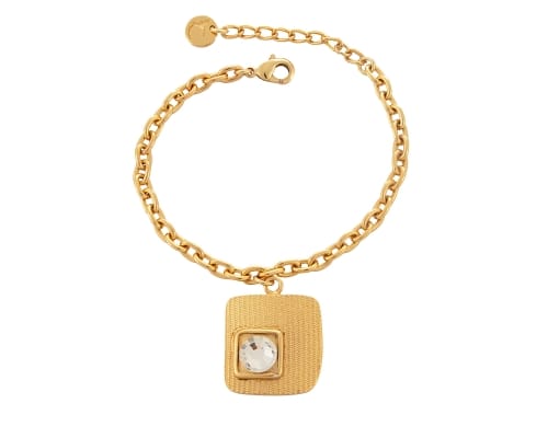 Bransoletka z zawieszką o prążkowanej teksturze, z kryształkami Preciosa , to elegancki i stylowy dodatek do każdej kreacji. Pozłacane wykończenie dodaje jej subtelnego blasku, podkreślając luksusowy wygląd. Kwadratowa forma zawieszki nadaje bransoletce nowoczesnego charakteru, jednocześnie zachowując klasyczny design. Kryształki Preciosa dodają wyjątkowego połysku, przyciągając uwagę swoją subtelnością i elegancją. Prążkowana tekstura zawieszki dodaje interesującego wymiaru, nadając jej delikatny, ale zarazem wyrazisty wzór, który wyróżnia bransoletkę spośród innej biżuterii. Uniwersalny design sprawia, że może być doskonałym prezentem dla kogoś bliskiego lub samej siebie. Długość bransoletki 17 cm + 4 cm przedłużki. Wymiary zawieszki 2,2 cm/ 2 cm. Waga bransoletki 15 g.