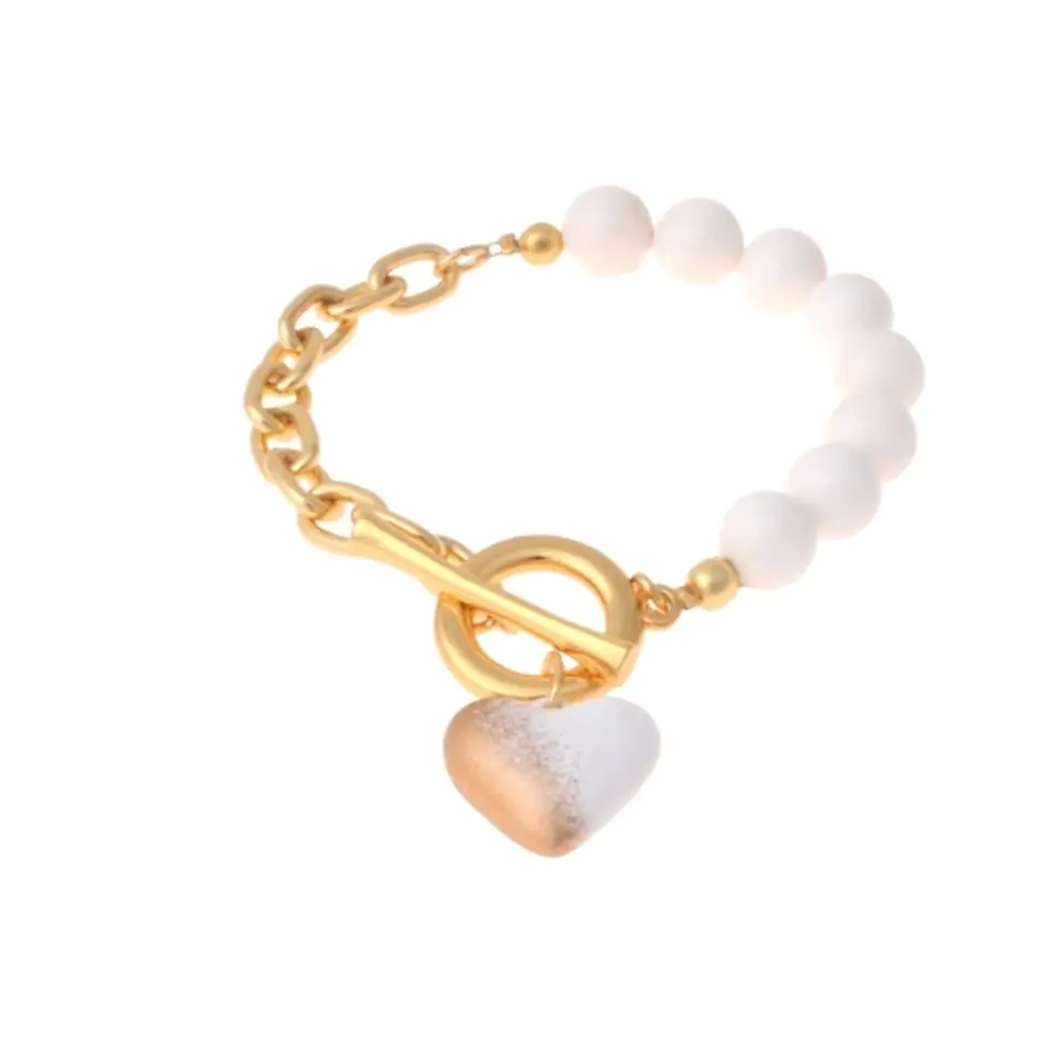 Bransoletka pozłacana wykonana z białego onyksu oraz łańcucha z pękatym emaliowanym sercem, na zapięciu typu toggle. Długość bransoletki 20,0 cm , szerokość 0,7 - 1,0 cm. Waga bransoletki 31,0 g.