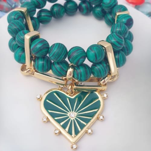 Pozłacana bransoletka z malachitów Colibra by Sviatlana z kolekcji BELLA, z malachitami z ręcznie malowanym, zielonym sercem, zdobionym kryształkami Preciosa. Bransoletka jest uniwersalna, gdyż jest na gumce. Wielkość serduszka ok 3,5cm/3,5 cm.