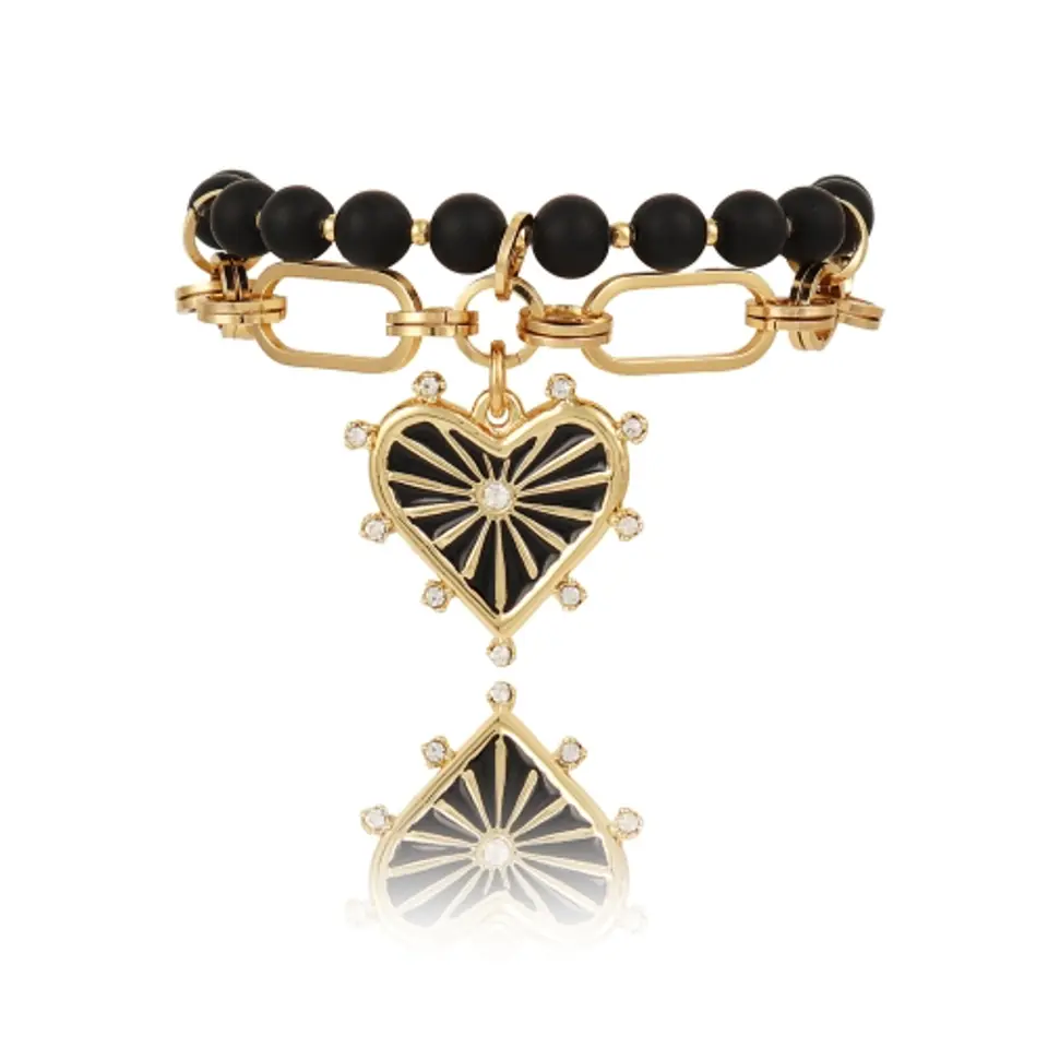 Pozłacana bransoletka z onyksów Colibra by Sviatlana z kolekcji BELLA, z ręcznie malowanym, czarnym sercem, zdobionym kryształkami Preciosa.