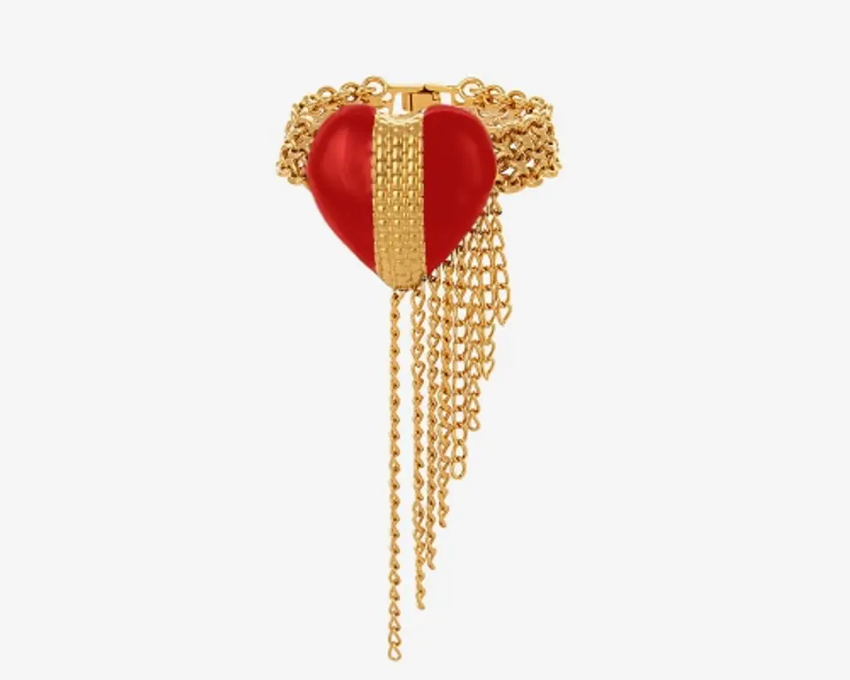Pozłacana bransoletka bismark z ręcznie malowanym na czerwono sercem z wiszącymi łańcuszkami. Długość bransoletki ok 16,5 cm. Wielkość serca ok 4 cm/ 4 cm. Długość bransoletki 18 cm + 4 cm.