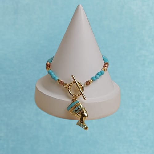 Subtelna, a zarazem wyrazista, ręcznie wykonana bransoletka z naturalnych turkusów to wyjątkowy dodatek dla kobiet ceniących oryginalność i symbolikę. Główną ozdobą jest zawieszka z wizerunkiem Nefretete – legendarnej królowej Egiptu, uosabiającej siłę, piękno i ponadczasową elegancję. Turkus, od wieków uznawany za kamień ochronny, harmonizuje energię i wzmacnia intuicję. Jego niebieskozielona barwa pięknie kontrastuje z metalową zawieszką w stylu antycznym, nadając całości unikalnego, etnicznego charakteru. Idealna do noszenia solo lub w zestawie z naszyjnikiem z tej samej kolekcji. Długość bransoletki 18 cm.