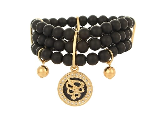 Pozłacana bransoletka z trzech rzędów onyksów Colibra by Sviatlana z kolekcji EDEN, z wężem w ręcznie malowanej na czarno zawieszce, zdobionej kryształkami Preciosa i z kuleczkami. Średnica zawieszki 2,2 cm.