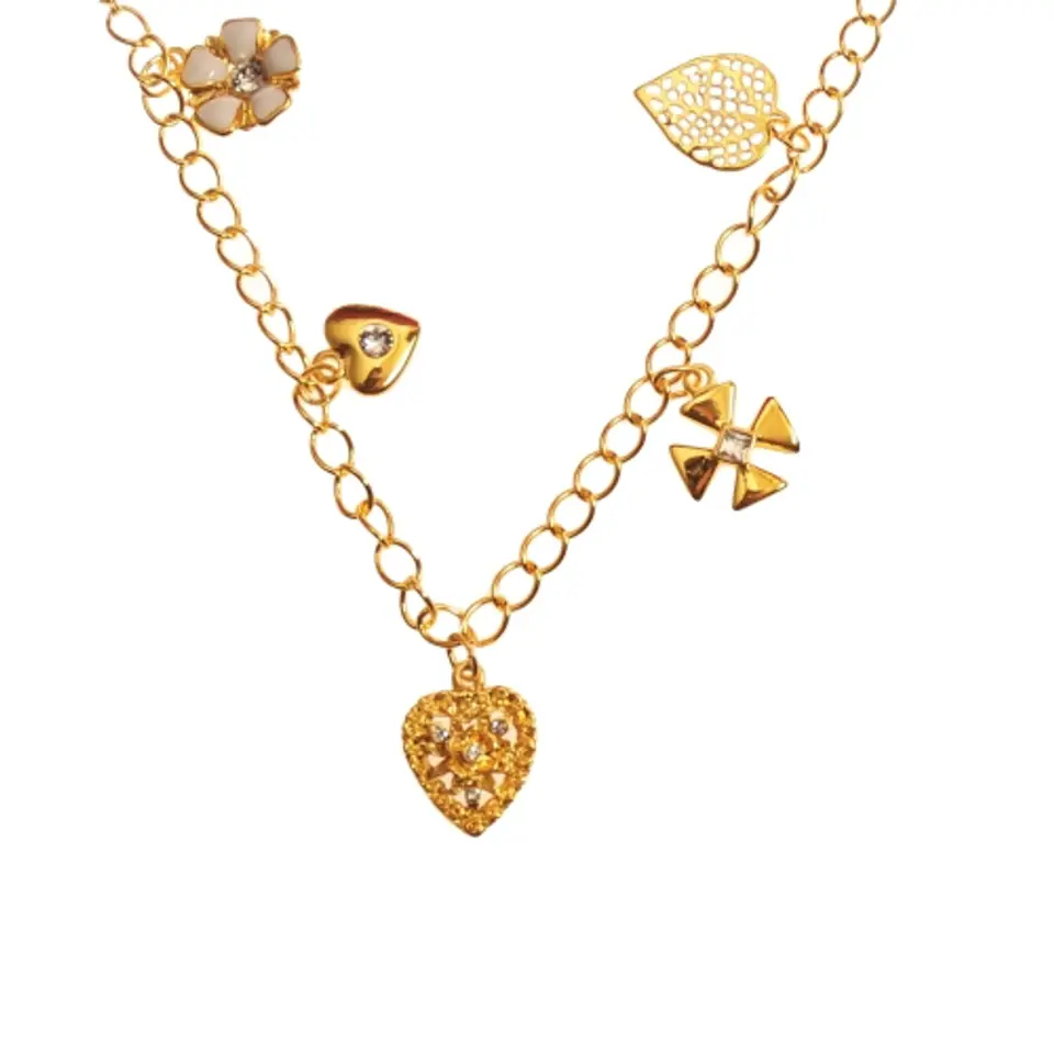 Bransoletka z zawieszkami doskonale pasuje do plażowych stylizacji. Bransoletka w złotym kolorze. Długość bransoletki 22 cm. Zawieszki typu charms - kwiatuszek, liść, konieczynka, serduszko z kryształem oraz serduszko z kryształków.