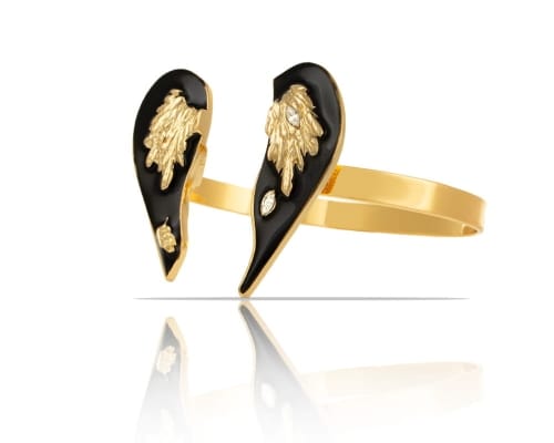 Sztywna, pozłacana, ręcznie malowana na czarno bransoletka ze skrzydłami w połówkach serc, zdobionych kryształkami Preciosa. Bransoletka z kolekcji Angel Svietlana by Colibra. Bransoletkę można dogiąć, lub rozgiąć w zależności od grubości ręki.