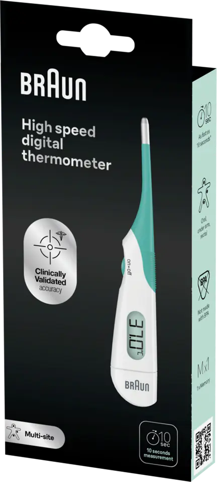 Termometr cyfrowy do szybkich pomiarów Braun (PRT1000) Zaufaj marce nr 1 polecanej przez lekarzy1 1Braun jest wiodącą marką pod względem świadomości, rekomendacji i stosowania w domu według ankietowanych lekarzy. GFK, badanie online na grupie n=800 lekarzy pierwszego kontaktu i pediatrów w czterech krajach europejskich (n=200 osób w DE, UK, FR, NL), przeprowadzone od listopada do grudnia 2022 r. DO STOSOWANIA W WIELU MIEJSCACH: Ten termometr cyfrowy jest odpowiedni do pomiaru temperatury w jamie ustnej, odbycie lub pod pachą. KLINICZNIE POTWIERDZONA DOKŁADNOŚĆ: Zmierz temperaturę w domu mając pewność, że dokładność pomiaru termometrem Braun jest potwierdzona klinicznie. Termometr cyfrowy do szybkich pomiarów Braun – idealne rozwiązanie do dokładnych pomiarów temperatury w domu i w podróży. Dokładność tego kompaktowego urządzenia cyfrowego z elastyczną końcówką została potwierdzona klinicznie; jest ono przeznaczone dla całej rodziny, od noworodków po dorosłych. Idealny do zastosowań w domu i w podróży, oferuje elastyczność pomiarów w jamie ustnej, odbycie lub pod pachą, zapewniając szybkie i dokładne wyniki w zaledwie 10 sekund.* Zaufaj marce nr 1 wśród lekarzy 1 dzięki cyfrowemu termometrowi do szybkich pomiarów Braun umożliwiającemu dokładne odczyty temperatury. Absolutny niezbędnik w każdym gospodarstwie domowym. *Czas testów laboratoryjnych wynosił średnio mniej niż 10 sekund, doświadczenie w użyciu może się różnić. SZYBKIE ODCZYTY: Uzyskaj szybkie i dokładne wyniki w zaledwie 10 sekund* DELIKATNA, ELASTYCZNA KOŃCÓWKA: Zapewnia komfortowe stosowanie przez całą rodzinę, od dorosłych po dzieci i niemowlęta. Opakowanie i kolory produktu mogą nieznacznie różnić się od przedstawionych na zdjęciach. Niektóre znaki towarowe zostały wykorzystane na podstawie licencji firmy The Procter & Gamble Company lub jej podmiotów stowarzyszonych.