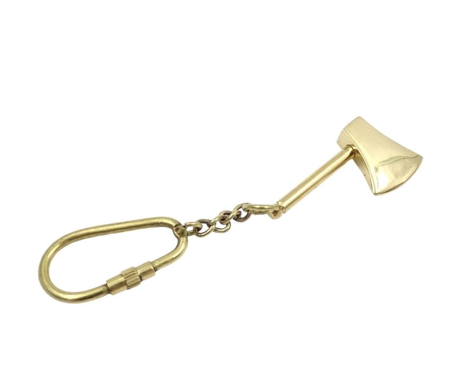 Brelok do kluczy Siekiera KRT27 Materiał - mosiądz Kolor - złoty Wymiary: ·Długość breloka - 5,7 cm ·Szerokość breloka - 2,3 cm ·Długość całkowita - 11 cm