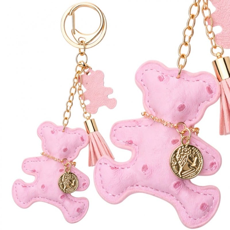Brelok do kluczy skórzany MIŚ różowy, frędzle BRL356