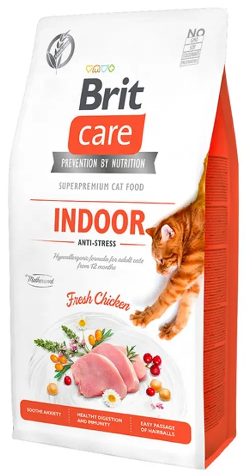 Brit Care Cat Grain Free Indoor Anti-StressKompletna karma dla dorosłych kotów od 12 miesiąca życia.Koty żyjące w domu są często narażone na różnego rodzaju stres, który może wynikać ze zmian terytorialnych, takich jak zmiana miejsca zamieszkania, zmiana aranżacji mebli, przeprowadzka, wyjazdy wakacyjne itp. Wszystkie te sytuacje mają negatywny wpływ wpływ na układ nerwowy i krwionośny kota.