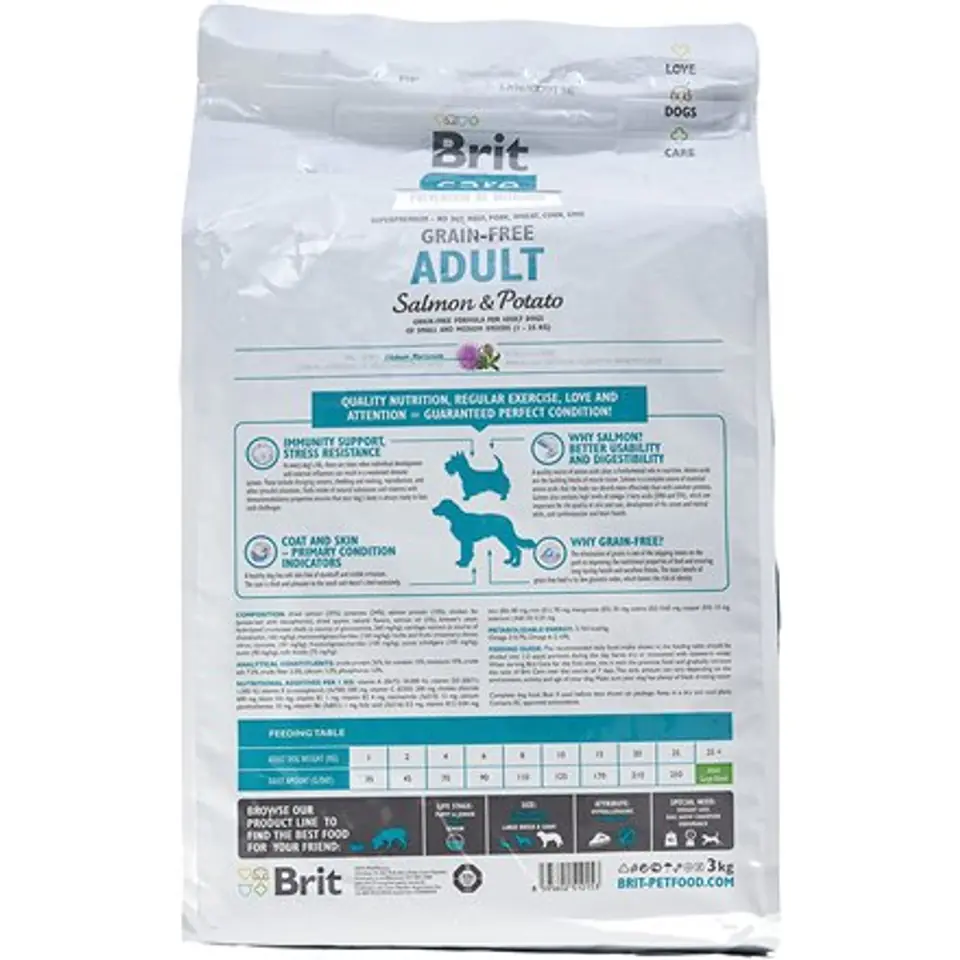 suszony łosoś (35%), ziemniaki (34%), białko łososia (10%), tłuszcz z kurczaka (konserwowany tokoferolami), suszone jabłka, naturalne aromaty, olej z łososia (2%), drożdże browarniane, hydrolizat muszli skorupiaków (źródło glukozaminy, 260 mg/kg), ekstrakt z chrząstki (źródło chondroityny, 160 mg/kg), mannanooligosacharydy (150 mg/kg), zioła i owoce (rozmaryn, goździki, owoce cytrusowe, kurkuma, 150 mg/kg), fruktooligosacharydy (100 mg/kg), Jukka Schidigera (100 mg/kg), inulina (90 mg/kg), ostropest plamisty (75 mg/kg).