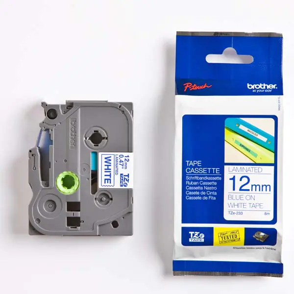 Brother oryginalny taÂśma do drukarek etykiet, Brother, TZE-233, niebieski druk/biaÂły podkÂład, laminowane, 8m, 12mm