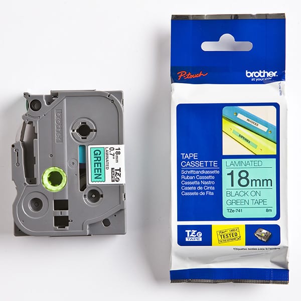 Brother oryginalny taśma do drukarek etykiet, Brother, TZE-741, czarny druk/zielony podkład, laminowane, 8m, 18mm