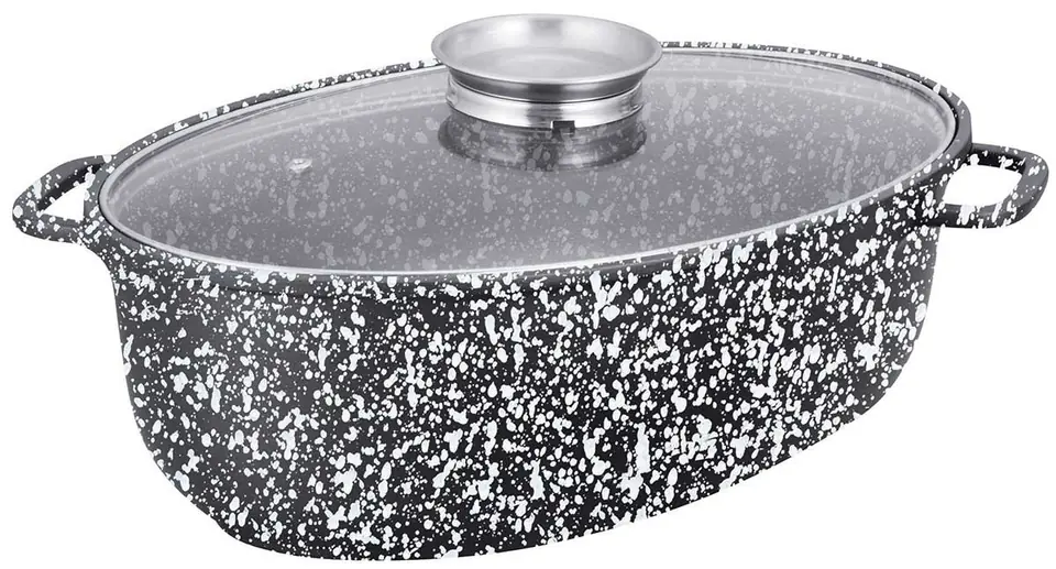 Brytfanna z pokrywą pokryta ceramiczną marmurową powłoką nieprzywierającą. Naczynia wykonane ze stopu aluminium posiadają indukcyjne ferromagnetyczne dno. Są przystosowane do współpracy z każdym rodzajem kuchni, także płytami indukcyjnymi. Naczynie w komplecie posiada żaroodporną pokrywę z aromatyzerem, dzięki której możemy uzupełnimy płyny w przygotowywanej potrawie bez ściągania pokrywy co pozwoli nam nie utracić tak niezbędnych w pożywieniu witamin i nada potrawie wspaniały smak.