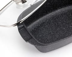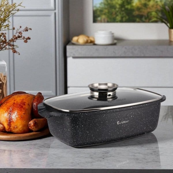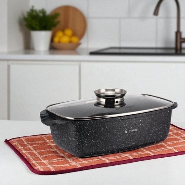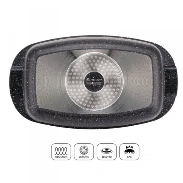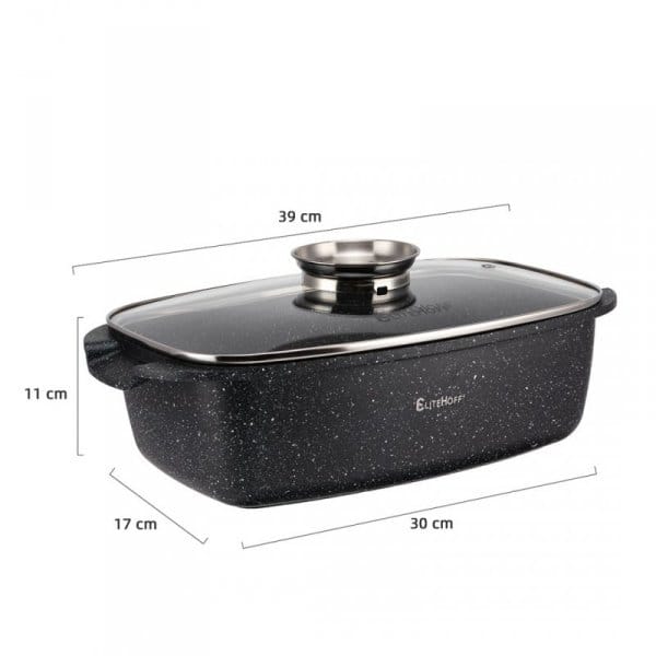 Brytfanna wykonana z odlewu aluminium. Nowej generacji powłoka marmurowa to wybór dla wszystkich, którzy chcą w prosty sposób przygotowywać zdrowe i smaczne posiłki, zapomnieć o przywieraniu jedzenia do dna garnka czy brytfanny i serwować potrawy o naturalnym smaku i w pełni soczyste. Można stosować zarówno do gotowania na kuchence jak i w piekarniku.