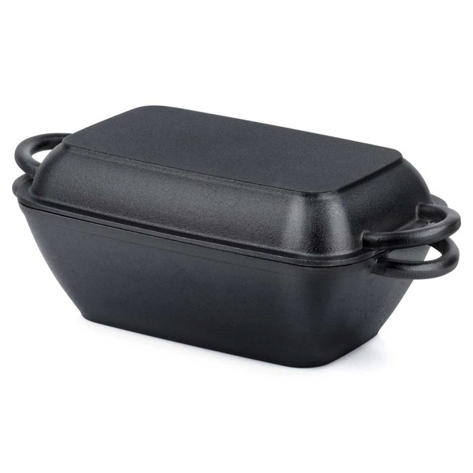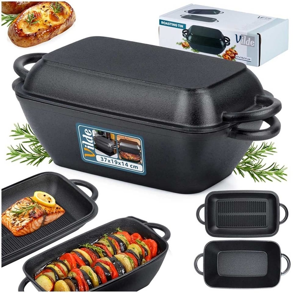 - Brytfanna żeliwna 2w1 - Brytfanna z pokrywką, która stanowi również osobne naczynie do zapiekania. Brytfanna doskonale nadaje się do pieczenia, duszenia i zapiekania mięs, warzyw, ziemniaków. Po zdjęciu pokrywki uzyskujemy dwa oddzielne naczynia. Wymiary zewnętrzne brytfanny bez pokrywki: 37,5 x 19 x 9,5 cm, wysokość z pokrywką wynosi 14 cm, a pojemność 3,5 l. Pokrywka z powłoką grillową ma wymiary 37,5 x 19,5 x 5 cm i pojemność 1,5 l.