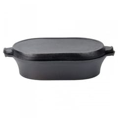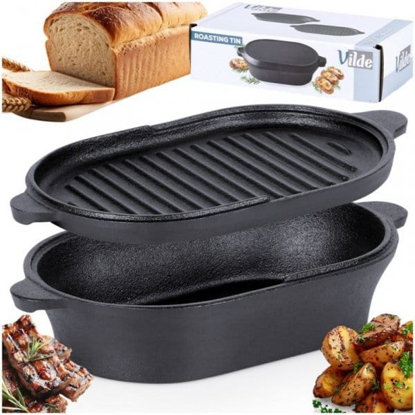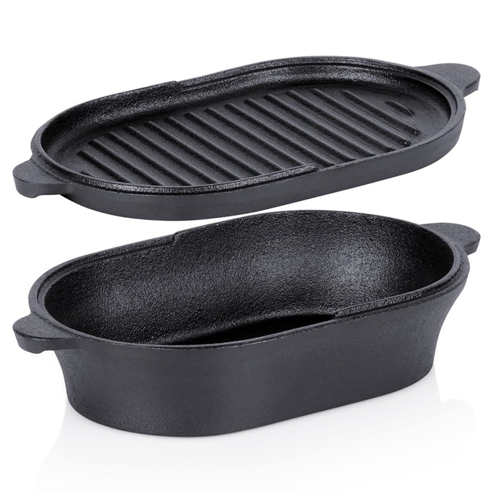 - Brytfanna żeliwna 2w1 - Mała brytfanna z pokrywką, która stanowi również osobne naczynie do zapiekania. Brytfanna doskonale nadaje się do pieczenia, duszenia i zapiekania mięs, warzyw, ziemniaków. Po zdjęciu pokrywki uzyskujemy dwa oddzielne naczynia. Wymiary zewnętrzne brytfanny bez pokrywki: 28 x 16 x 5,5 cm, wysokość z pokrywką wynosi 7,2 cm, a pojemność l. Pokrywka żeliwna z powierzchnią grillową ma wymiary 28 x 16 x 2 cm.