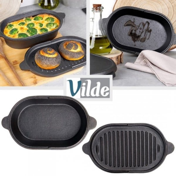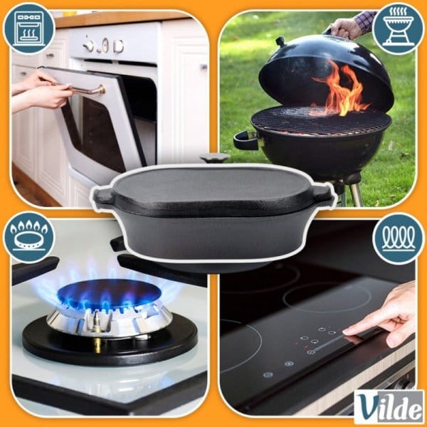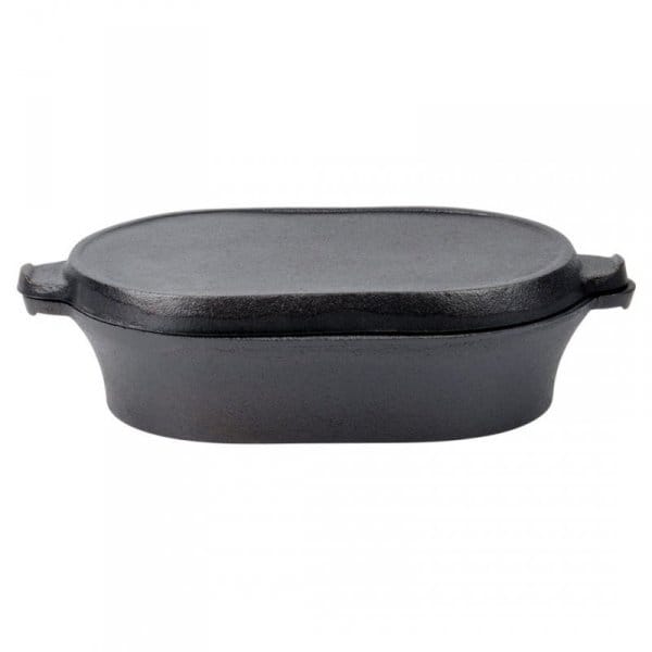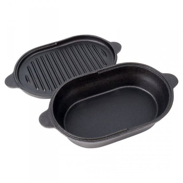 Brytfanna żeliwna z pokrywą pełniącą rolę patelni grillowej. Nadaje się na każdy rodzaj kuchni włącznie z indukcją. Można stosować w piekarnikach i bezpośrednio na ogniu.