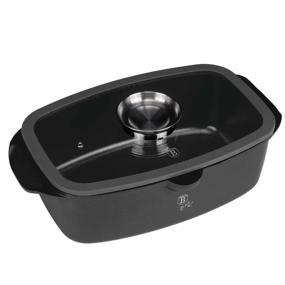 Brytfanna do pieczenia 32 x 21 x 10,6 cm o pojemności 6L z nieprzywierającą powłoką tytanową, produkt firmy BERLINGER HAUS z serii Antracite CollectionCechuje się wytrzymałą konstrukcją, która niezawodnie opiera się wypaczeniom i dobrze nagrzewa się, zapewniając równomierną dystrybucję ciepła na całej powierzchni. Pokrywa ze szkła hartowanego zawierająca uchwyt z dozownikiem ze stali nierdzewnej (Arom Knob). Dzięki innowacyjnemu uchwytowi typu Aroma Knob można w wygodny sposób dozować do wnętrza brytfanny przyprawy lub oliwę np. smakową. Umożliwia wygodne dolewanie wody / oliwy lub wina w trakcie pieczenia i gotowania bez konieczności podnoszenia pokrywy co sprawia, że potrawy stają się jeszcze bardziej aromatyczne. Potrawa będzie dzięki temu soczysta i nie przypali się. Stanowi idealne uzupełnienie wielu innych elementów kolekcji Berlinger Haus Antracite Collection.