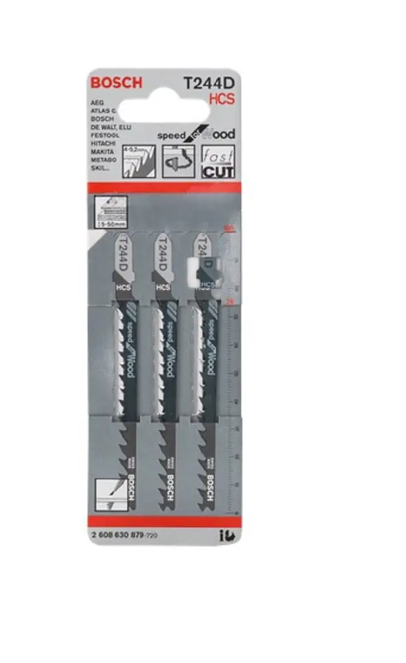 T 244 D Speed for Wood – brzeszczot do wyrzynarki Do wyrzynarek Brzeszczot T 244 D Speed for Wood do wyrzynarki umożliwia szybkie krzywoliniowe cięcia w drewnie. Ostro szlifowane, rozwarte zęby pozwalają na szybkie cięcie Wąskie ostrze jest zoptymalizowane do cięcia krzywoliniowego Pasuje do wszystkich wyrzynarek z uchwytem typu T. Producent: Robert Bosch Power Tools Adres korespondencyjny: Max-Lang-Strasse 40-46, Leinfelden-Echterdingen Adres e-mail: kontakt@bosch.de