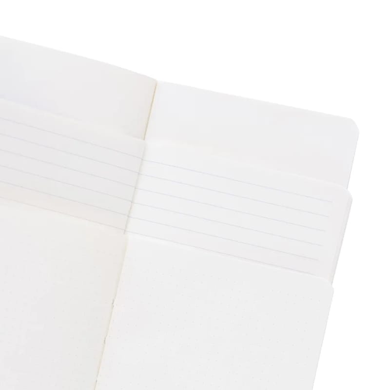 Zestaw oferuje różnorodne wnętrze – każdy notes ma inny rodzaj stron: w linie, w kropki lub czyste, dzięki czemu można wykorzystać je do notatek, planowania, szkicowania lub prowadzenia kreatywnego dziennika.