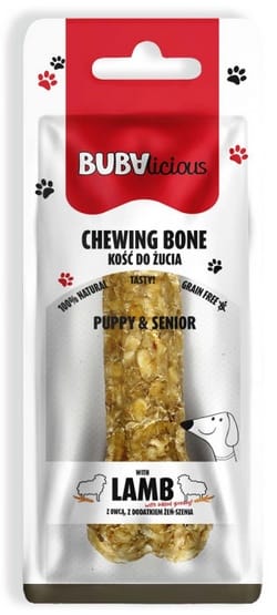 BUBAlicious Kość Puppy & Senior z owcą i dodatkiem żeń-szeniaNaturalna, smakowita i trwała kość do żucia dla szczeniątBUBAlicious Kość Puppy & Senior z owcą to aromatyczna, twarda i w pełni naturalna kość, która wspiera jedną z podstawowych potrzeb każdego psa - żucie! Żucie pomaga w codziennej higienie jamy ustnej, wspierając mechaniczne usuwanie płytki nazębnej i ograniczając powstawanie kamienia.Poznaj składniki, które sprawiają, że kość jest wyjątkowa!