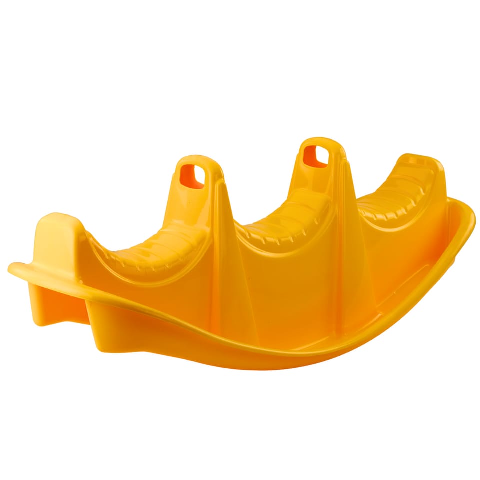 Zabawka posiada trzy wyprofilowane siedziska oraz ergonomiczne uchwyty, które zapewniają komfort i bezpieczeństwo podczas bujania. Jaskrawy kolor zachęca dzieci do zabawy i wspiera integrację społeczną poprzez zabawę grupową. Model sprawdzi się w ogrodzie, na placu zabaw, w salach zabaw czy w domowych warunkach.