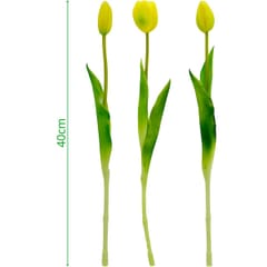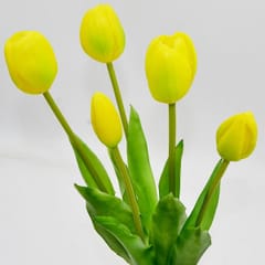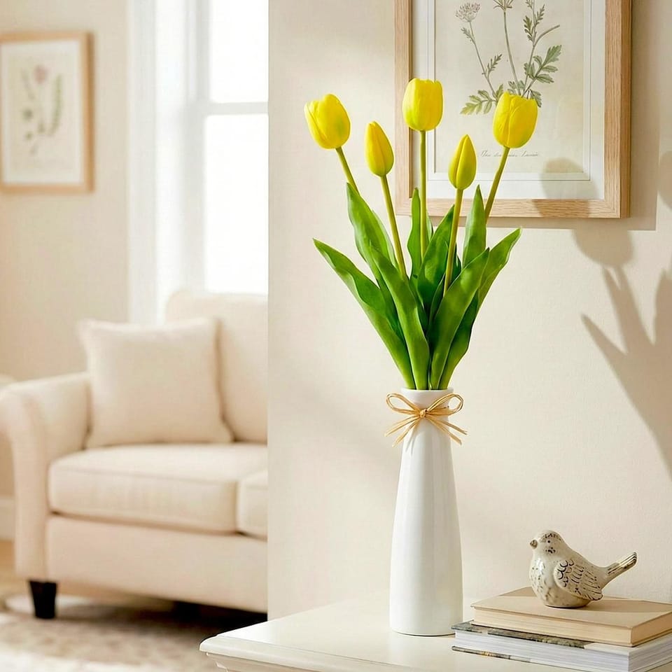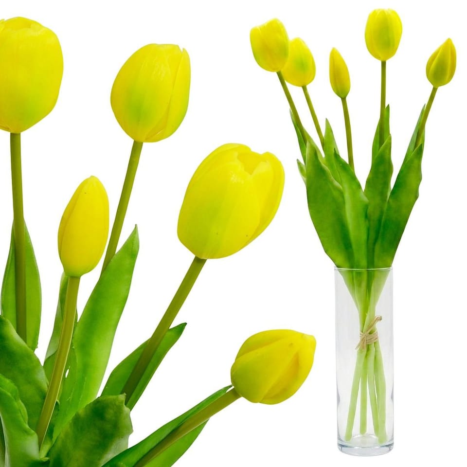 BUKIET 5 TULIPANÓW ŻÓŁTYCH 39CM JAK ŻYWYCH DEKORACJA WIOSENNA to idealne rozwiązanie dla osób, które chcą cieszyć się pięknem kwiatów przez cały rok. Sprawdzi się zarówno jako dekoracja codzienna, jak i sezonowa – szczególnie wiosną i na Wielkanoc.