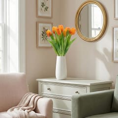 BUKIET 7 TULIPANÓW POMARAŃCZOWYCH 31CM JAK ŻYWYCH DEKORACJA WIOSENNA to szybki sposób na stworzenie efektownej aranżacji bez wysiłku. Gotowa kompozycja oszczędza czas, a realistyczne wykonanie gwarantuje świeży wygląd niezależnie od pory roku. To dekoracja zgodna z aktualnymi trendami wnętrzarskimi – naturalność, mocny kolor i wygoda.